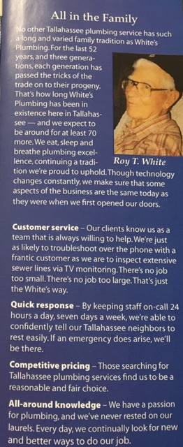 No other Tallahassee plumbing service has such a long and varied family tradition as White’s Plumbing. For the last 54 years, each generation has passed the tricks of the trade on to their progeny. That’s how long White’s Plumbing has been in existence here in Tallahassee – and we expect to be around for at least 70 more. We eat, sleep and breathe plumbing excellence, continuing a tradition we’re proud to uphold. Though technology changes constantly, we make sure that some aspects of the business are the same today as they were when we first opened our doors.